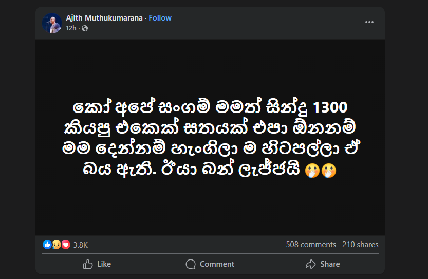 මේ දිනවල රටට බලපා ඇති දරුණු ආපදා තත්ත්වය හමුවේ, ත්රිවිධ හමුදාව, මාධ්ය ආයතන මෙන්ම බොහෝ කලාකරුවන්ද පෙරමුණට පැමිණ සහන කටයුතුවලට දායක විය. නමුත් මේ අතරතුර, ලාංකීය කලා ක්ෂේත්රයේ ප්රවීණ ගායන ශිල්පී අජිත් මුතුකුමාරන මහතා සමාජ මාධ්ය ඔස්සේ සිදුකළ ප්රකාශයක් මේ වන විට දැඩි කතාබහට ලක්ව තිබේ. තම නිල ෆේස්බුක් ගිණුමේ සටහනක් තබමින් ඔහු ප්රශ්න කර ඇත්තේ, මෙවන් අවස්ථාවක කලාකරුවන්ගේ සංගම් සිටින්නේ කොහේද යන්නයි. ‘මමත් සින්දු 1300ක් කියපු එකෙක්. සතයක් එපා, ඕන නම් මම දෙන්නම්. හැංගිලාම හිටපල්ලා, ඒ බය ඇති. ඊයා බන් ලැජ්ජයි 🤭🤭’ යනුවෙන් දැඩි ලෙස විවේචනය කරමින් ඔහු පවසා ඇත්තේ, කලා සංගම්වල නිහඬතාවය තමාට ලැජ්ජාවක් බවයි. ආපදාවකදී පවා මෙලෙස නිහඬව සිටින සංගම්වල ක්රියාකලාපය පිළිබඳව කලා ක්ෂේත්රය තුළින්ම මෙවන් ප්රබල හඬක් නැගීම බොහෝ දෙනාගේ අවධානයට ලක්ව ඇත.