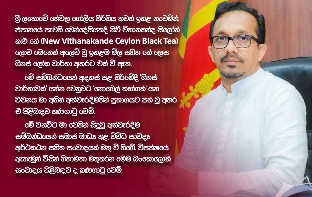කර්මාන්ත සහ ව්‍යවසායකත්ව සංවර්ධන අමාත්‍ය සුනිල් හඳුන්නෙත්ති මහතා පසුගියදා කළ ප්‍රකාශයක් මේ වන විට සමාජ මාධ්‍ය තුළ දැඩි කතාබහට ලක්ව තිබෙනවා. ශ්‍රී ලංකාවේ තේ නිෂ්පාදනයක් ලැබූ ගිනස් වාර්තාවක් සම්බන්ධයෙන් අදහස් දක්වද්දී, ‘ගිනස් වාර්තාව’ යන වචනය වෙනුවට අත්වැරදීමකින් ‘නොබෙල් තෑග්ග’ යන වචනය භාවිත වූ බවයි අමාත්‍යවරයා පසුව පැහැදිලි කළේ. මෙම සිදුවීමට මුල් වූයේ, ජපානයේ පැවති තේ වෙන්දේසියක දී ‘නිව් විතානකන්ද සිලෝන් කළු තේ’ සඳහා ලෝකයේ මෙතෙක් තේ සඳහා හිමිවූ ඉහළම මිල වාර්තා වීමයි. මෙය ශ්‍රී ලංකාවට ගෝලීය කීර්තියක් ගෙන දුන් සුවිශේෂී ගිනස් ලෝක වාර්තාවක්. සිය ෆේස්බුක් ගිණුම ඔස්සේ සටහනක් තබමින් අමාත්‍යවරයා මෙම වරද සම්බන්ධයෙන් කනගාටුව පළ කර ඇති අතර, ඇතැම් විපක්ෂ පාර්ශ්ව විසින් මෙම ‘බංකොලොත් සංවාදය’ හිතාමතාම මතු කිරීම පිළිබඳව ද සිය අප්‍රසාදය පළ කර තිබෙනවා. කෙසේ වෙතත්, මේ වන විටත් මෙම සිදුවීම සම්බන්ධයෙන් සමාජ මාධ්‍ය තුළ විවිධ අදහස් හුවමාරු වෙමින් පවතී.